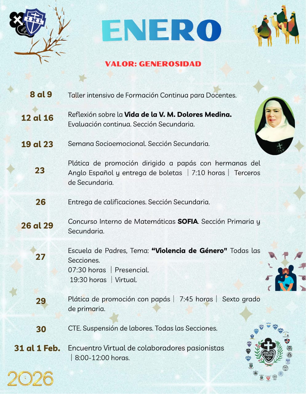 Retiros, salidas misioneras, muestras académicas y concursos, festivales, eventos artísticos, convivencias, paseos didácticos y recreativos.